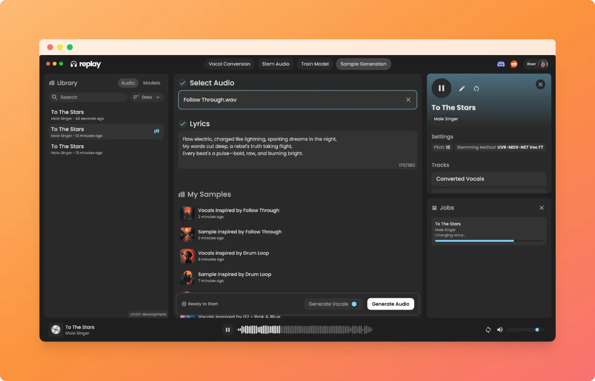 Replay 是 一款先进 AI 音乐伴奏分离软件,基于深度学习技术,能将音频文件中的主唱、人声和伴奏等音轨分离出来。用户只需输入一首完整歌曲,软件就会自动分析音频内容,提取各音轨并生成独立音频文件,在音乐制作人、KTV 伴奏制作、音乐教育等领域大有用处。它支持多种音频格式,用户界面简洁易用,适合不同水平用户操作,为音乐创作和分析带来极大便利与灵活性。