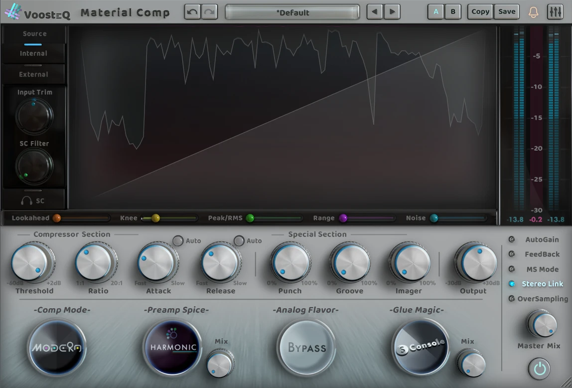 在音频处理的链条中,压缩器是平衡动态、塑造音色的 “隐形工匠”—— 既要驯服失控的峰值,又要保留声音的鲜活质感,这一矛盾在 VoosteQ 旗下的Material Comp 尖端音频压缩器插件中得到了完美化解。作为一款融合 “模拟温暖” 与 “数字精准” 的旗舰级工具,它以 “材质化动态处理” 为核心理念,通过复刻不同硬件压缩器的 “电路质感”,让压缩不再是冰冷的参数调节,而是对声音 “材质” 的精细雕琢,成为混音师塑造人声密度、乐器质感与整体动态的核心利器。