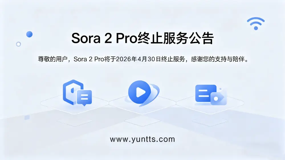 自 2026 年 6 月 30 日 23:59 起,Sora 2 Pro 将全面停止所有服务,包括但不限于 AI 视频生成(文生图、图生图模式)、作品导出、会员权益使用、历史作品查看等全部功能;届时,Sora 2 Pro 客户端(iOS/安卓)将无法启动,官方相关服务渠道同步关闭。